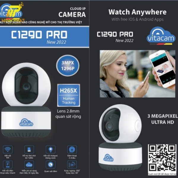 Camera IP Wifi VITACAM C1290 PRO, 3MPX - 2K, có Cổng Lan Tình Trạng: Còn Hàng Bảo hành: 12T - Model: C1290 PRO 3M - Thương hiệu: VITACAM